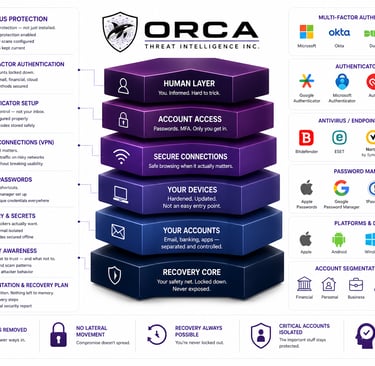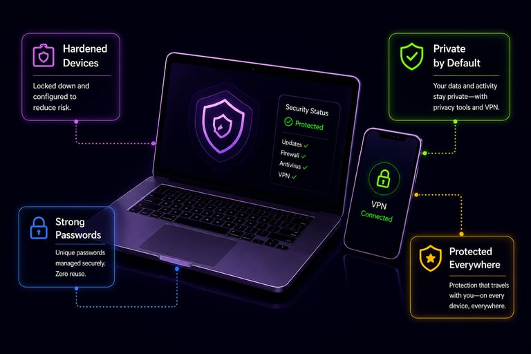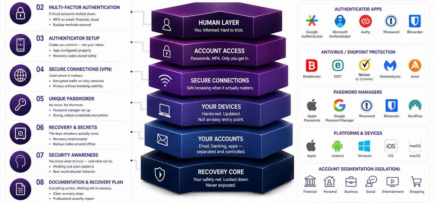 Hands-on for individuals and families. We close the gaps attackers rely on.