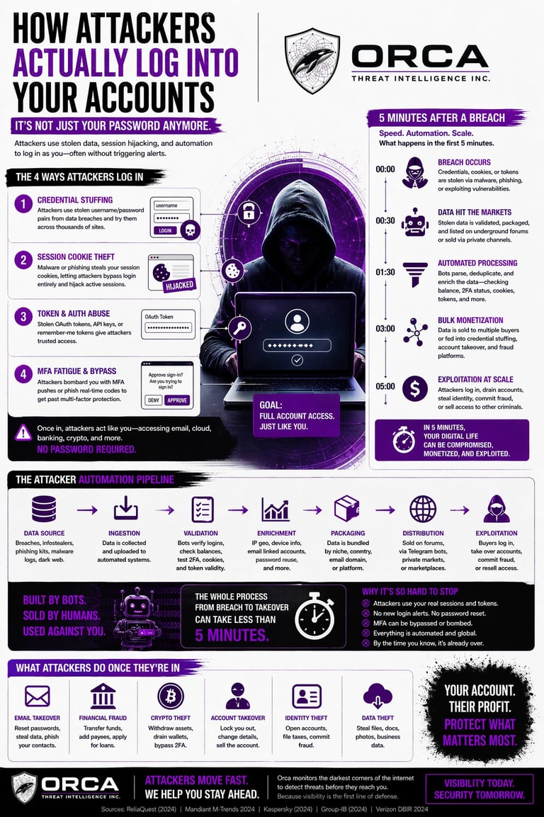 Attackers log in using stolen sessions, cookies, and automated pipelines that reuse your data across thousands of services.